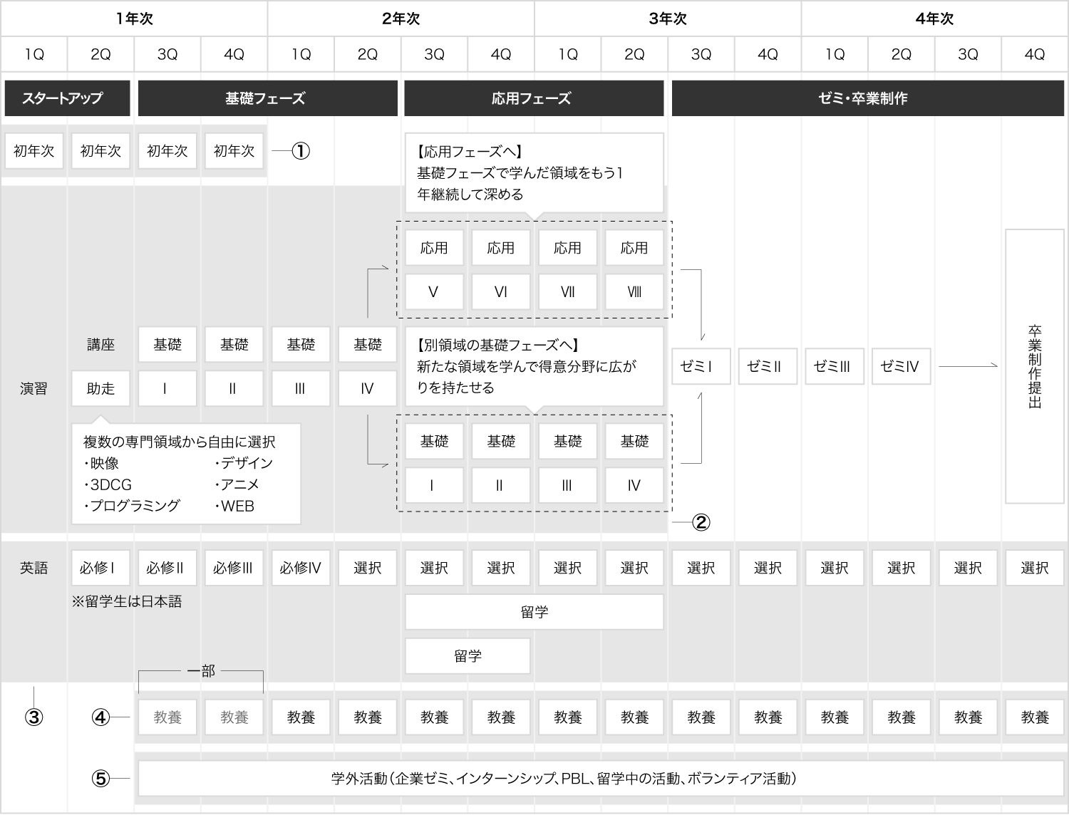 専門科目は、領域を一つに絞らずに複数の分野を並行して学ぶことが出来る。また、4年間の学修フェーズを「スタートアップ」「基礎フェーズ」「応用フェーズ」「ゼミ・卒業制作」の4つに大別し、学生は各フェーズの履修登録時に、これまで学習した領域について、継続して深めるのか、もしくは新たな領域を学修することにより対応の幅を広げてゆくのか、自らの適性等を鑑みながら段階的に学修を進めてゆく。