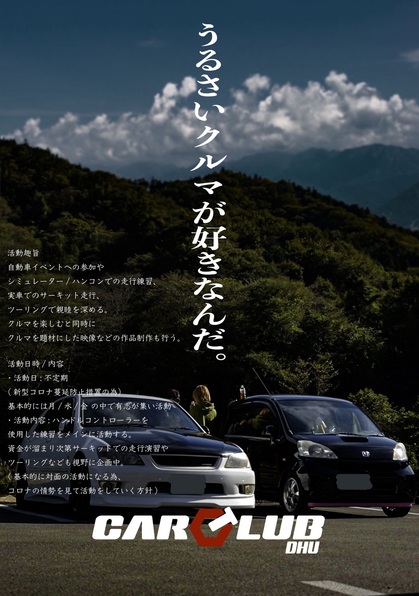 サークルサークルDHU Car Club HOME キャンパスライフ サークル DHU Car Club ツーリングやモータースポーツイベントへの参加を通して自動車文化の理解を深める。DHU Car Clubサークル趣旨ツーリングやモータースポーツイベントへの参加を通して自動車文化の理解を深める。サークル活動内容毎週水曜木曜5-6限の時間で集まります関連リンクTwitterDiscord https://test-www.dhw.ac.jp/life/club/dhu-car-club/ リンクをコピー サークル一覧