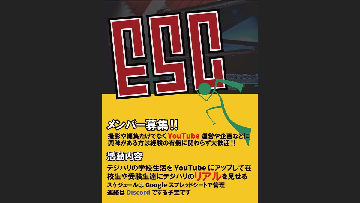 サークルサークルESC エスケープ HOME キャンパスライフ サークル ESC エスケープ YouTubeの動画発信を中心に行い、デジハリ生や大学に興味を持ってくれている方々にこの大学とサークルを知ってもらう。ESC エスケープサークル趣旨YouTubeの動画発信を中心に行い、デジハリ生や大学に興味を持ってくれている方々にこの大学とサークルを知ってもらう。サークル活動内容企画提案、動画撮影、編集関連リンクYouTubeTwitterInstagram https://test-www.dhw.ac.jp/life/club/esc/ リンクをコピー サークル一覧
