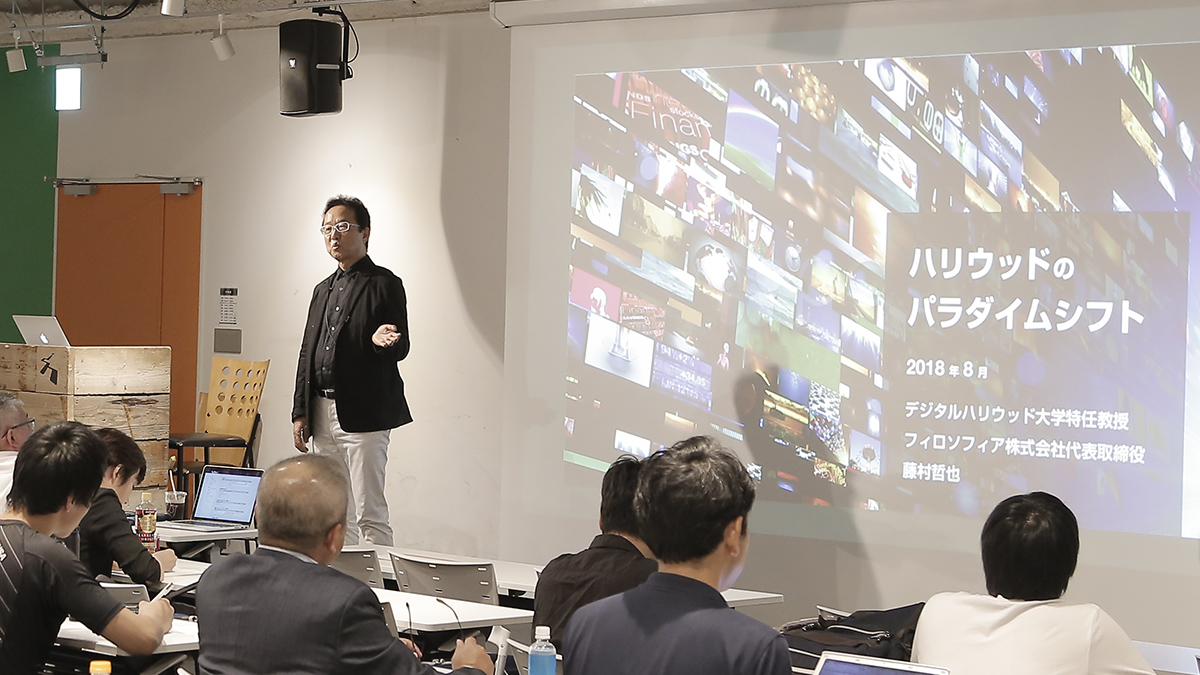 デジタルハリウッド大学では、2018年8月2日、ギャガ株式会社の創業者・フィロソフィア株式会社代表取締役社長であり、本学の特任教授でもある藤村哲也氏による特別講義「ハリウッドのパラダイムシフト」を開催しました。