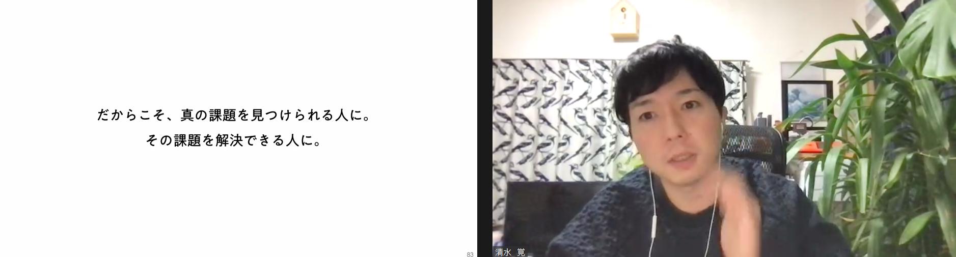 講師を務めてくださったのは、大手企業に在籍しブランディング業務に携わりながら、複業活動として企画とデザインを提供する個人事業「オクノテ」を開業し、二足の草鞋で活躍している清水覚さんです。