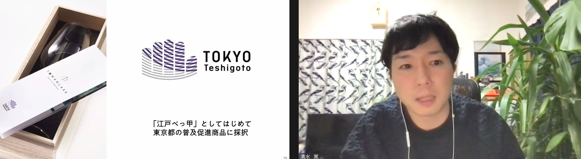 まず一つ目が、べっ甲を扱う製作所の事例です。工芸品として扱われるべっ甲の美しいまだら模様は、職人の技術によって生み出されています。清水さんが関わった製作所の職人の方は、「唯一無二のものを作りたい。『美しい!』『すごい!』『高くても買いたい!』と思ってもらえる高品質な商品を作らなければいけない。」という考えをお持ちだったそうです。清水さんはこの考えに賛同し、美しく、べっ甲の工芸的な価値を落とさないような、持ち手と台座部分にべっ甲を使用したワイングラスをデザインされました。しかし、このワイングラスの完成は一筋縄ではいかず、べっ甲の持つ水や熱への弱さをデザインで克服するだけではなく、デザインやアイデアを実現するための技術を持つ企業を探し回ることになったそうです。企業によってはデザイン案を聞いて“無理”の一言で断られることもあったそうですが、複数の中小企業の技術が集結し、ようやくべっ甲のワイングラスが完成しました。