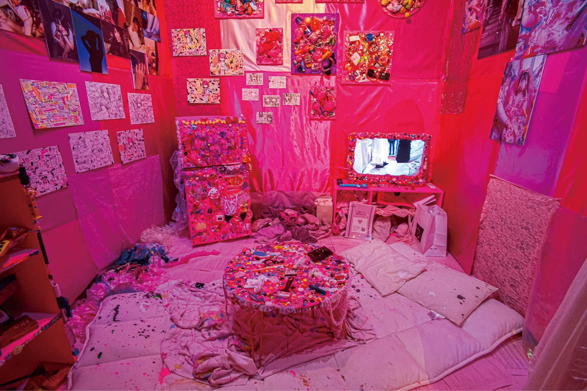 「何様シラン」が、自身の本名をタイトルに掲げた作品です。私が一番好きなピンク色の絵の具で家電や家具を塗り、その上に素材を加えています。私は「ものを捨てられない」「何でも忘れたくない」性格で、この作品では些細な瞬間(昔UFOキャッチャーで景品を取ったときの感情)を保存したいという気持ちを表現しています。「なかひらさくら」という人間をストレートに表現しており、「あなたにただ感じてほしい」という「お前何様?」的な作品を楽しんで頂きたいです。